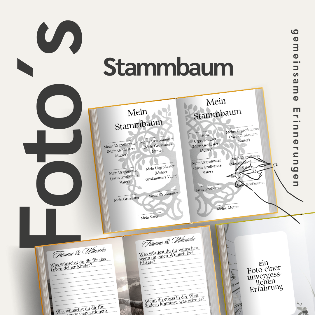 Keine Sorge! Die geführten Fragen und klaren Anleitungen machen es leicht, deine Lebensgeschichte zu teilen, ohne dich überfordert zu fühlen. Du musst kein großartiger Schreiber sein, um deine Erinnerungen festzuhalten.