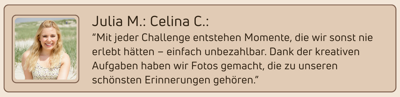 Von Sommer bis Winter – jede Challenge bringt euch näher zusammen und sorgt für Spaß fernab von Bildschirmen. So entstehen Erinnerungen, die bleiben.