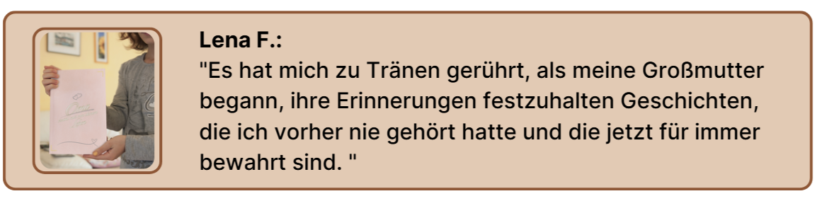 Keine Sorge! Die geführten Fragen und klaren Anleitungen machen es leicht, deine Lebensgeschichte zu teilen, ohne dich überfordert zu fühlen. Du musst kein großartiger Schreiber sein, um deine Erinnerungen festzuhalten.
