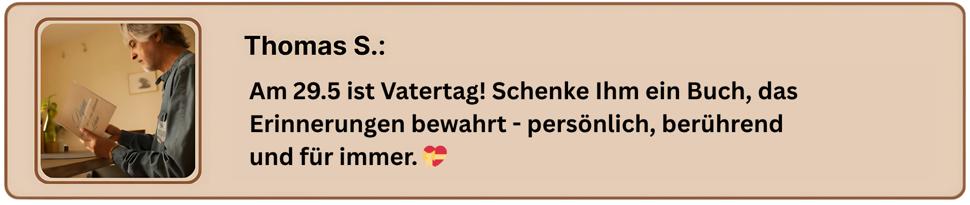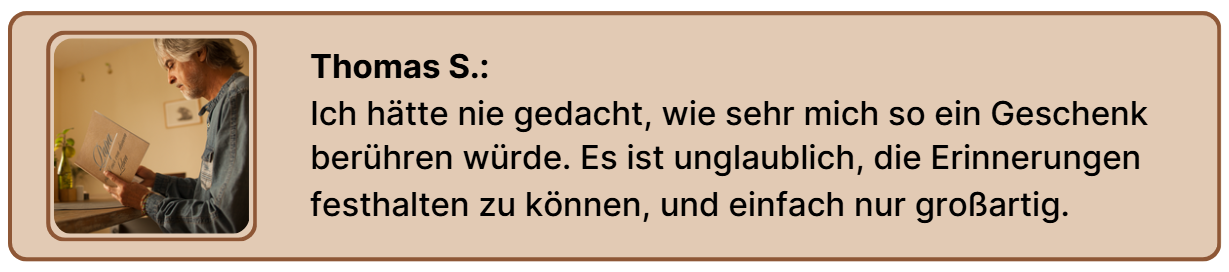 Keine Sorge! Die geführten Fragen und klaren Anleitungen machen es leicht, deine Lebensgeschichte zu teilen, ohne dich überfordert zu fühlen. Du musst kein großartiger Schreiber sein, um deine Erinnerungen festzuhalten.